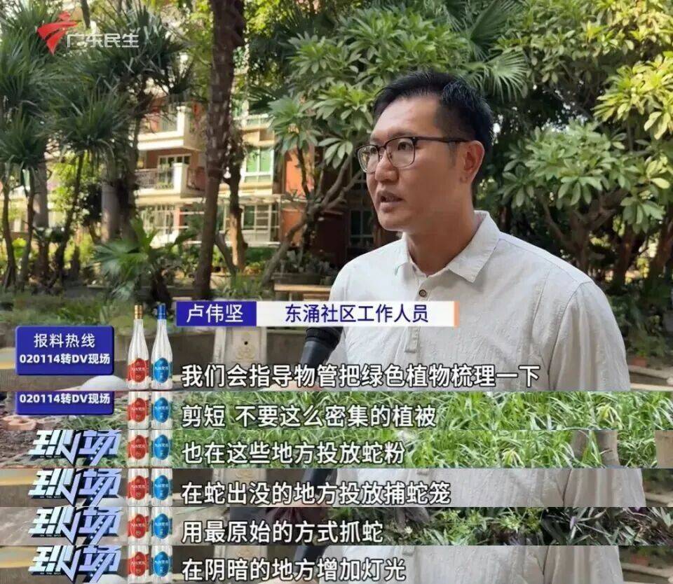 小区属地东涌社区表示,此前已经联系锦绣物业管理方,据物业统计,今年内捕捉的蛇约20条,针对小区出现蛇患的情况,会指导物业采取相应的治理措施。